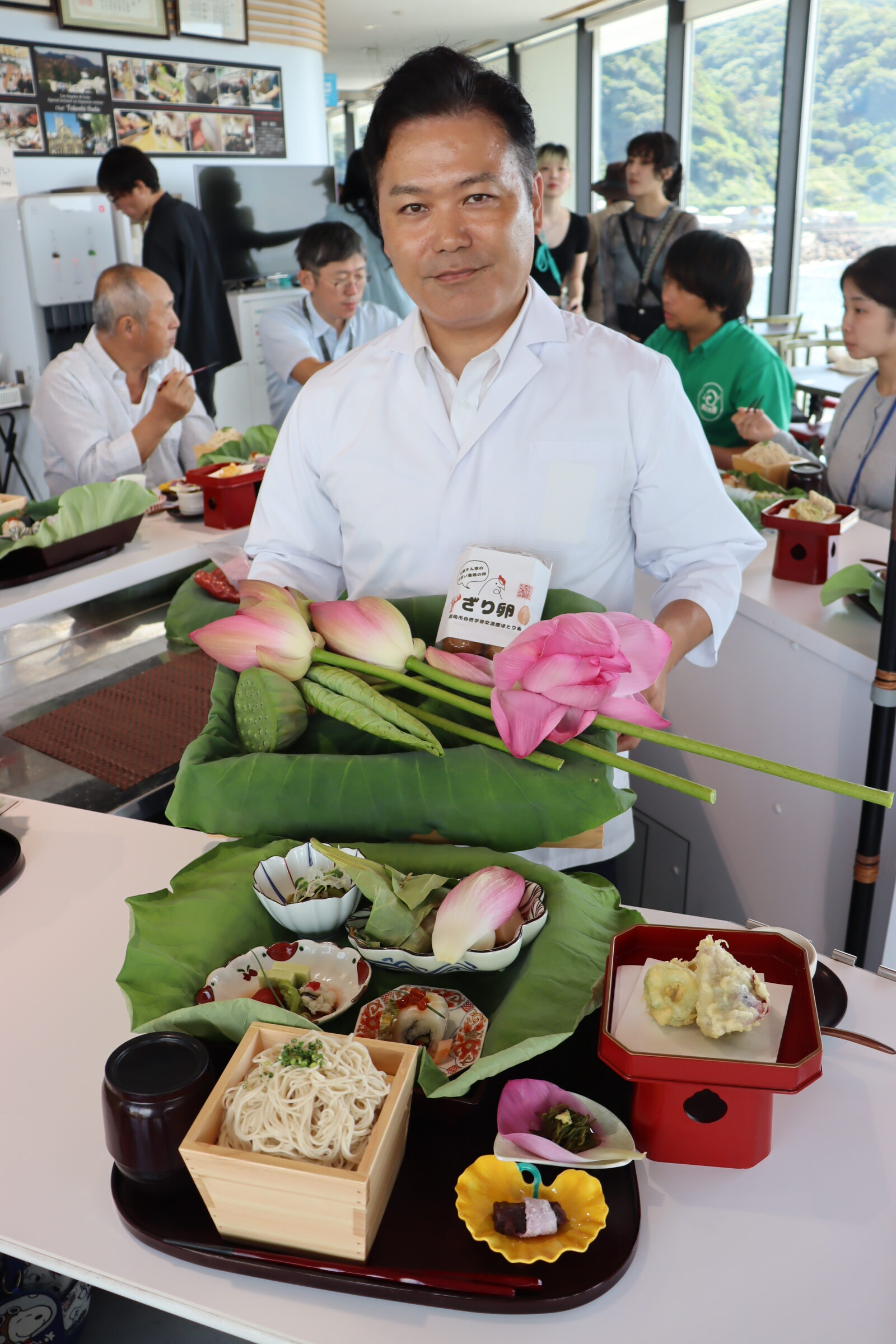 このお膳は、大山下池に自生するハスを活用して地域資源の有効利用を進める「本町浮草組合」(田中富雄組合長)を応援しようと、同店の須田剛史料理長(50)が考案しました。