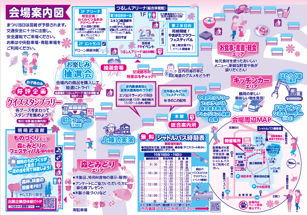 シャトルバスは、両日とも 市役所~会場間 及び 鶴岡駅~市役所~会場間 で運行します。