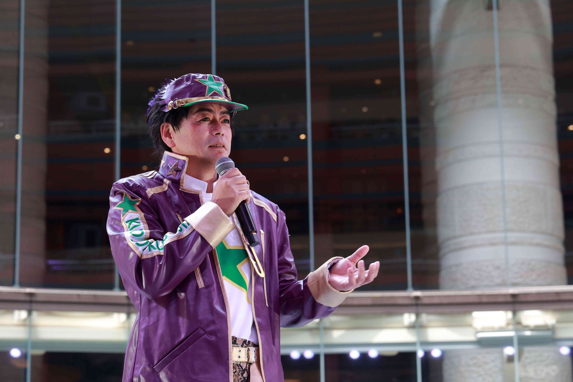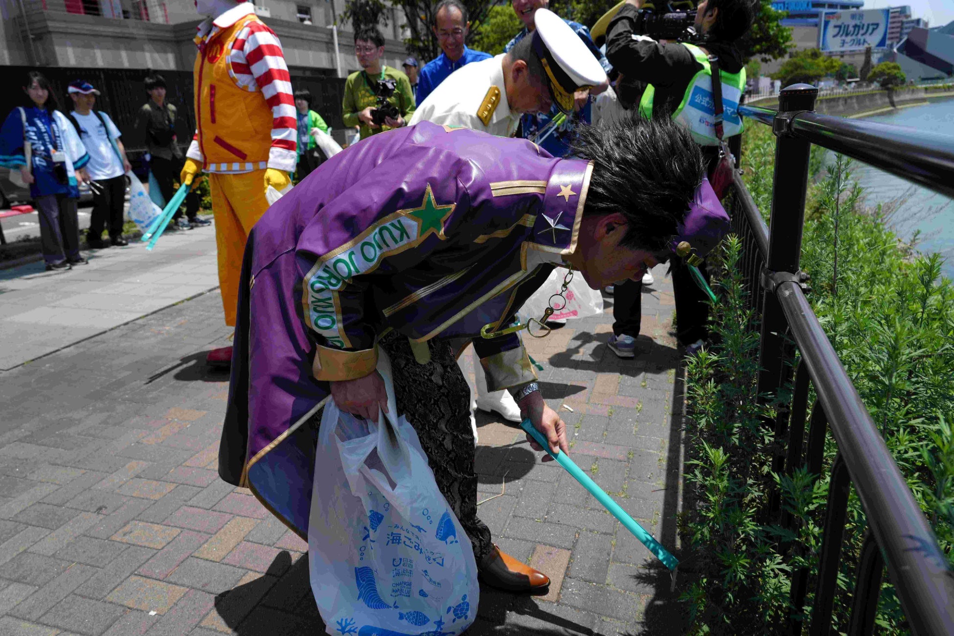 「海ごみゼロウィーク」主催者として日本財団から常務理事 海野光行氏、環境省からは環境大臣政務官 国定勇人氏、後援として福岡市副市長 中村英一氏が登壇。海野氏はジョジョの奇妙な冒険の空条承太郎のコスプレをし、ステージ登壇者とともにジョジョ立ちを披露し、場を盛り上げました。それぞれの代表者から、「海洋ごみを減らすためにまずは陸地のごみを清掃しないといけない」という重要性を会場に集まった参加者に呼びかけ、「ごみを拾って、海を守るばい!」の掛け声で清掃活動がスタートしました。