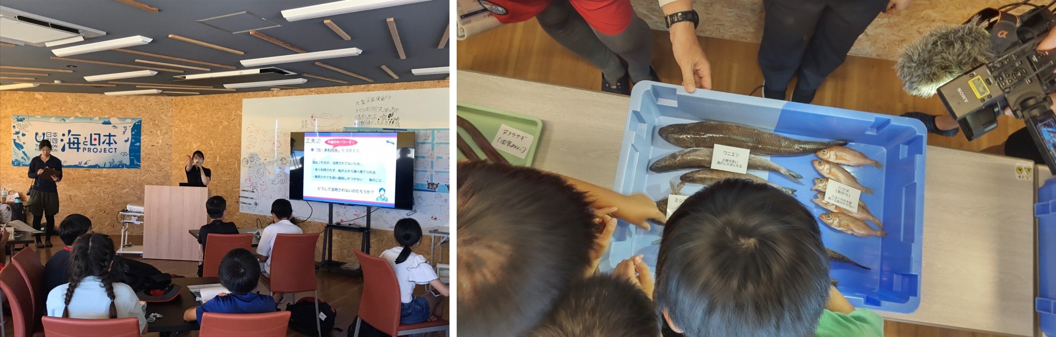 漁獲量が著しく減ってきている昨今、今まで廃棄または漁師のみが食してきた「低未利用魚」の活用と付加価値向上を図っている例を庄内浜を救うヒントの一つとして、山形県の水産研究所の研究員さんにご講演いただきました。低未利用魚を原料とした魚醤の紹介やどうやったら付加価値を向上していけるか子どもたちに一緒に考えてもらいました。学んだあとは実際に低未利用魚ってどんな魚なのか、実物に見て触って体感してもらいました。グロテスクな容姿や衝撃の手触りを直に感じた子どもたちは悲鳴や歓声をあげ楽しんでいる姿が印象的でした。