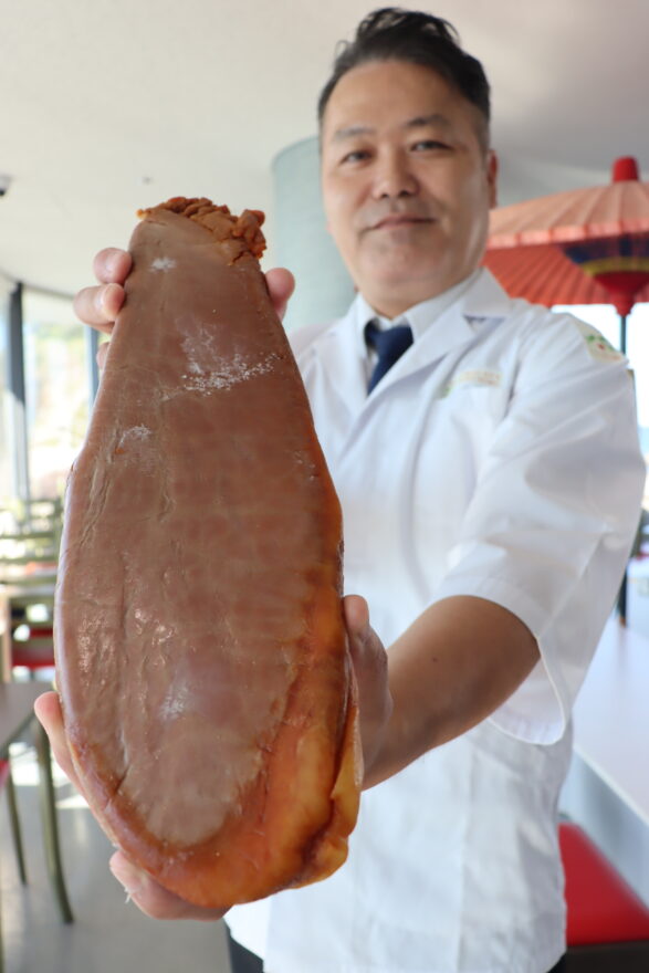 今年6月に漁獲されたクロマグロの卵を塩漬けし、約5カ月かけて自然乾燥。ほどよい塩味とマグロ特有の深いコクが楽しめる“庄内発のからすみ”に仕上がりました。着色料などの添加物は一切使用していません。須田料理長は「マグロの卵はボラより水分が多く、塩加減や乾燥の具合に苦労した。色合いを自然に出すのも難しかった」と振り返り、「軽く炙ると香ばしさと旨味がさらに引き立つ」と話しています。